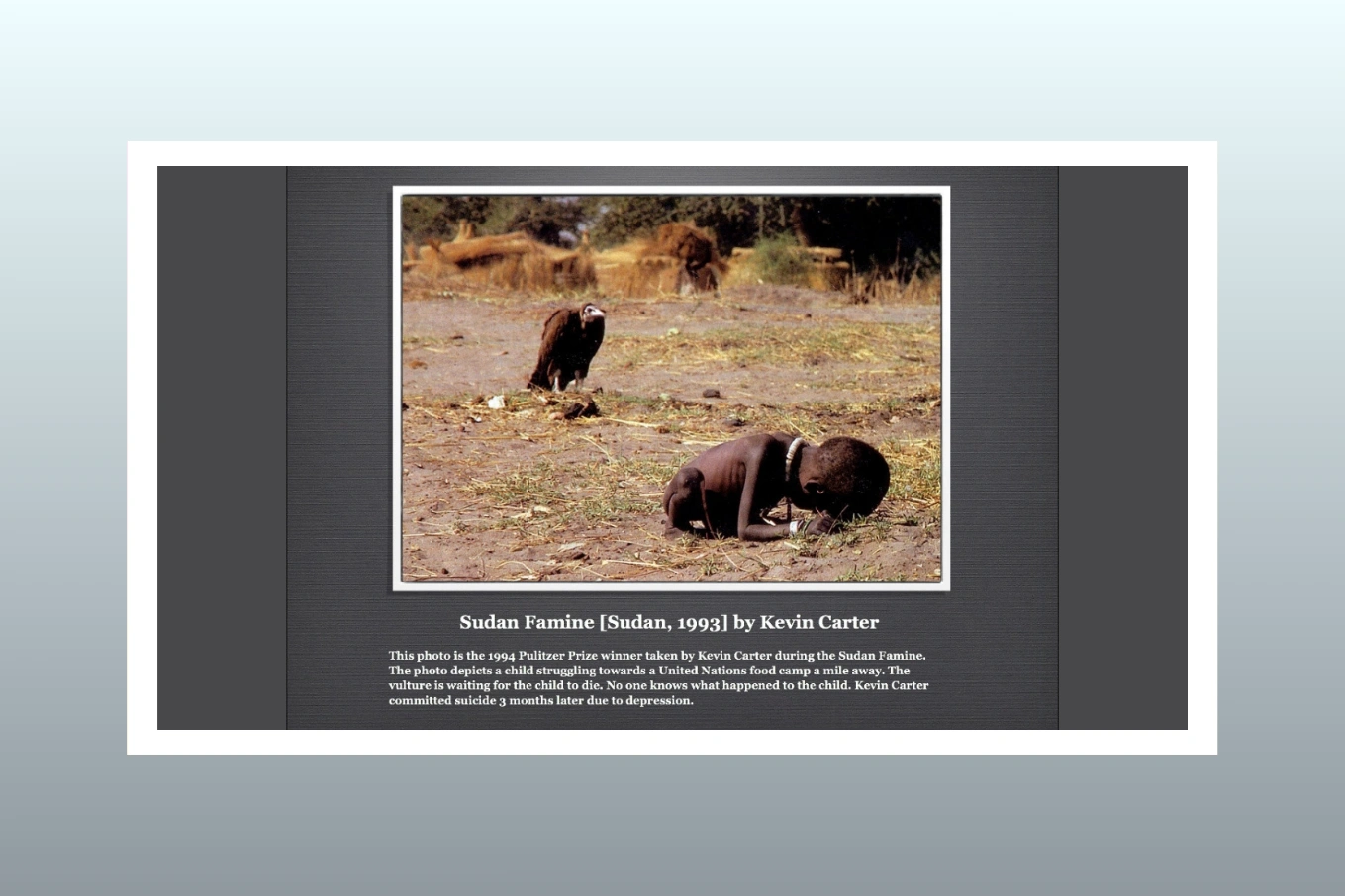 Despite its acclaim, the photograph sparked intense ethical debate. Critics and the public questioned why Carter did not intervene to help the child, focusing on the moral responsibilities of photojournalists in crisis situations. The scrutiny weighed heavily on him, compounding the psychological toll of years spent documenting violence and suffering. Tragically, Carter took his own life four months after receiving the Pulitzer Prize.